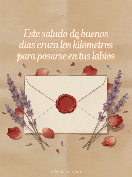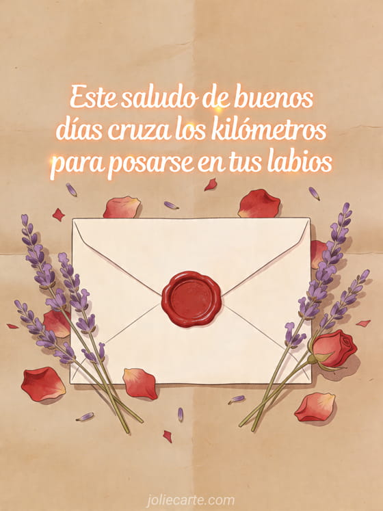 Compartan un mensaje tierno a distancia con esta tarjeta gratis de buenos días con una carta sellada, lavanda seca y pétalos de rosa sobre papel kraft. Descubran también buenos días mi amor a distancia, cita extrañar amor distancia o mensaje amor a distancia.