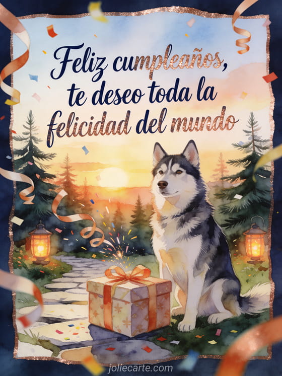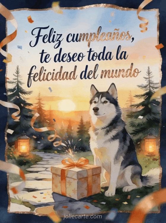 Envía un saludo de cumpleaños conmovedor con un husky orgulloso junto a un regalo envuelto en un jardín de pinos al amanecer. Cintas, confeti brillante y linternas encendidas crean una escena cálida para desearle toda la felicidad del mundo. Descubran también un poema para el cumpleaños de mi hijo, un poema de cumpleaños para mi hijo o un poema de cumpleaños para mi hijo.