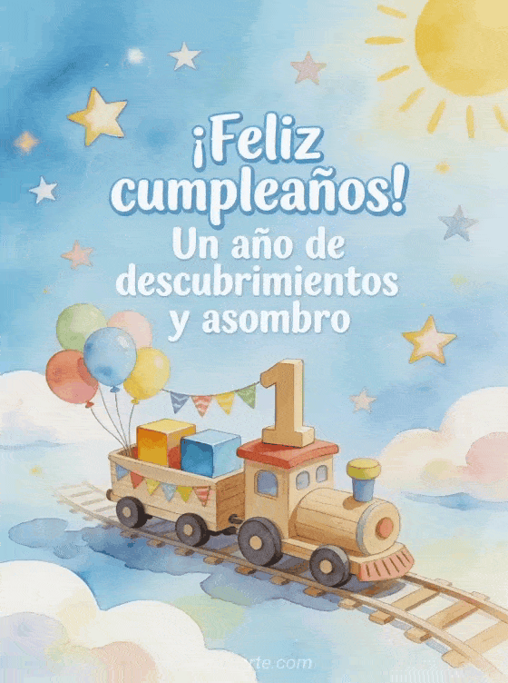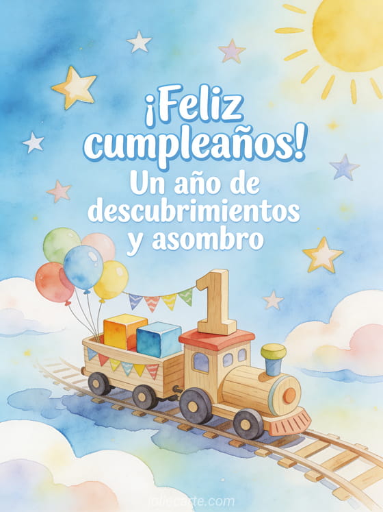 Celebren el primer año de un bebé niño con una tarjeta suave en acuarela que muestra cubos de madera formando el número 1, un tren de juguete con globos y banderines, nubes suaves, estrellas y luz azul cielo. Descubran también bebé desea feliz cumpleaños, feliz cumpleaños mi bebé 2 años o texto cumpleaños bebé 1 año.