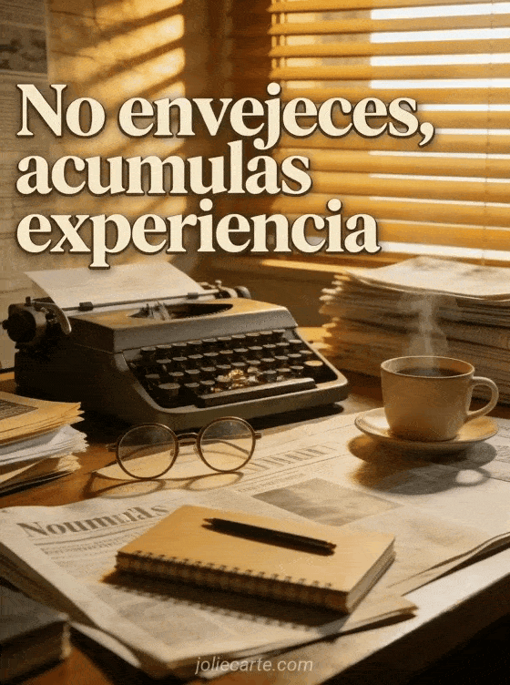 Sorpréndelo con un divertido mensaje de cumpleaños que dice "No envejeces, acumulas experiencia." Esta tarjeta gratis presenta una máquina de escribir vintage y un escritorio de redactor antiguo con un toque de humor intelectual. Descubre también una tarjeta cumpleaños hombre humor o una cita de cumpleaños hombre.