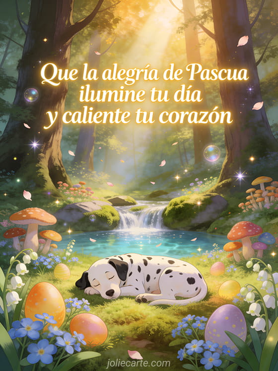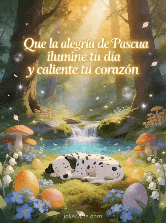 Comparte este tierno texto de Pascua con un perro dálmata en un bosque primaveral con lirios de los valles. Descubre también gif animado felices Pascuas o gifs de Pascua.