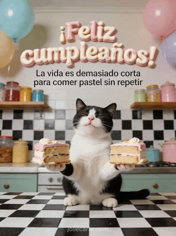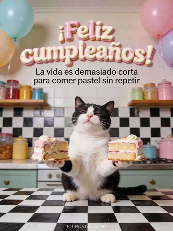 Hazlos reír con esta graciosa tarjeta de cumpleaños con un gato blanco y negro que sostiene dos trozos de pastel. Descubre también un gif cumpleaños gato gracioso o un gif cumpleaños gracioso.