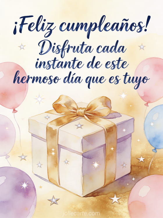 Envía un texto para cumpleaños con una tarjeta luminosa de regalo, globos pastel y estrellas doradas que celebran un día único. Descubre también texto tarjeta cumpleaños, mensaje cumpleaños y mensaje cumpleaños sms.