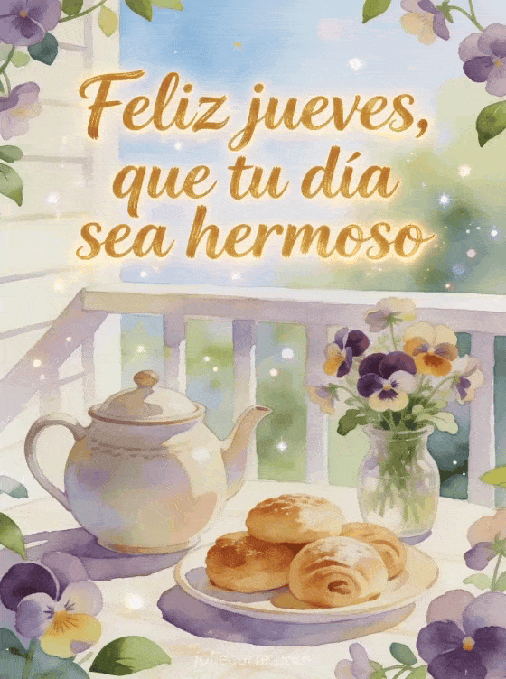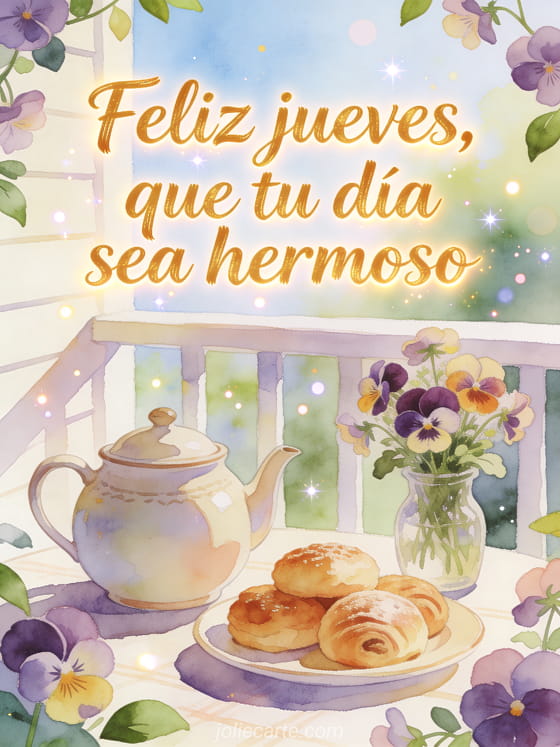 Desea feliz jueves y un día hermoso con un desayuno acogedor en la veranda, una tetera de cerámica, pan dulce fresco y pensamientos bajo luz brillante de la mañana. Comparte esta tarjeta benevolente y descubre también feliz jueves besos gifs, feliz jueves gif animado o feliz jueves imágenes de corazones.