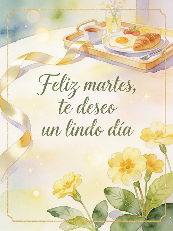 Envía feliz martes, te deseo un lindo día con caligrafía verde salvia, flores de prímula, una cinta satinada y una bandeja de desayuno luminosa. Descubre también feliz martes invernal gif, feliz martes amigos imagen o muy bellas imágenes feliz martes.