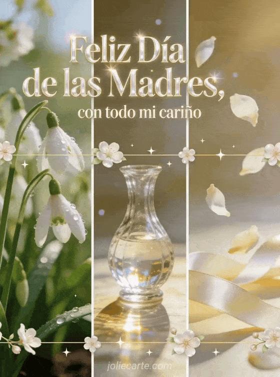 Comparte un texto para el Día de las Madres en una tarjeta fotorrealista de tres paneles con campanillas de invierno, un jarrón de cristal, pétalos pálidos, cintas de seda y pequeñas estrellas. Descubre también Feliz Día de las Madres imágenes, poema corto para el Día de las Madres o imágenes gratis del Día de la Madre.