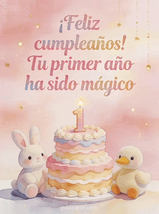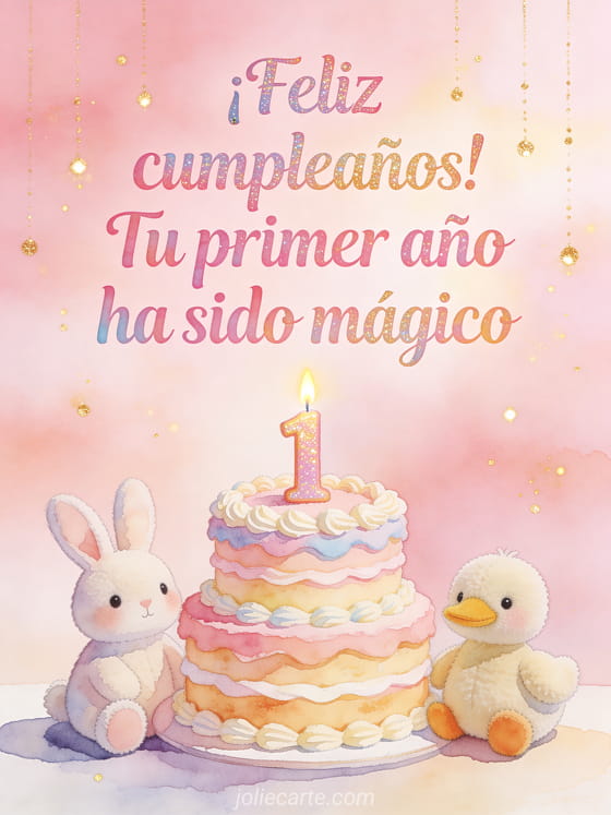 Celebren un primer año mágico con una tarjeta suave en acuarela que muestra un hermoso pastel de pisos con una vela número 1, crema pastel, un conejo de peluche y un pato alrededor del pastel, y brillo dorado sobre un fondo rosa empolvado. Descubran también feliz cumpleaños mi bebé, feliz cumpleaños mi bebé de 1 año o texto primer cumpleaños bebé.