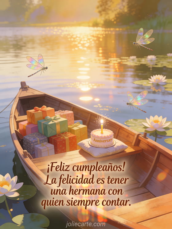 Celebra el cumpleaños de tu hermana con esta poética tarjeta que muestra una barca de madera en un lago tranquilo con nenúfares, regalos coloridos y un elegante pastel con vela brillante bajo la luz dorada de la mañana. Descubre también una tarjeta de cumpleaños para hermana o una tarjeta de cumpleaños para una hermana.