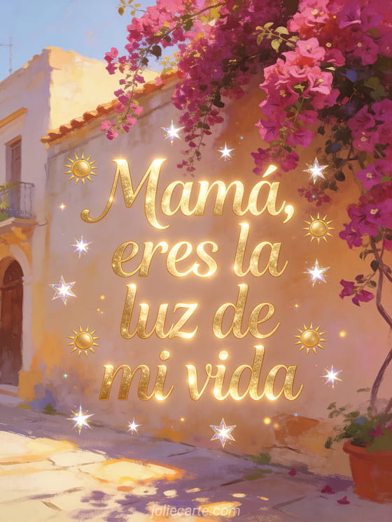 Dile a tu mamá que es la luz de tu vida con esta hermosa tarjeta del día de la madre con letras doradas y buganvilla magenta. Descubra también imágenes feliz día de la madre o hoy es el día de la madre.