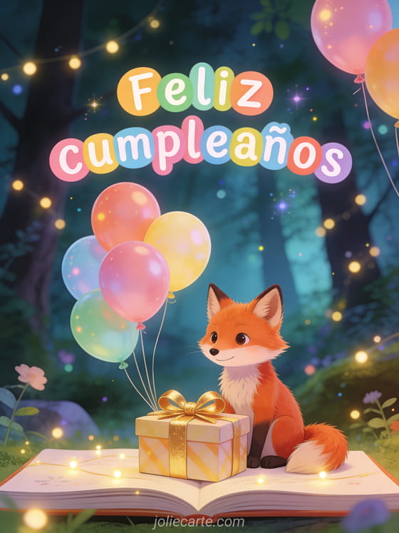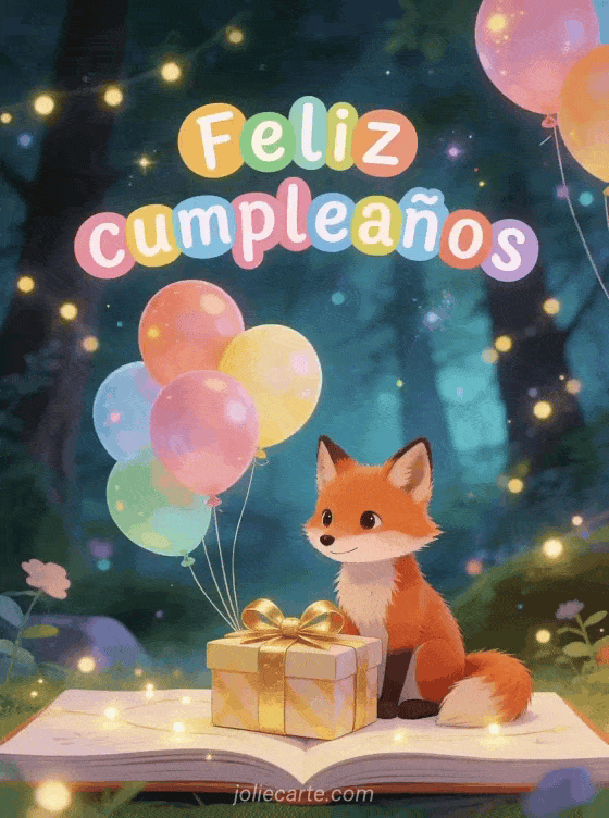 Celebren un feliz cumpleaños con esta tarjeta de ambiente encantado, un zorro adorable, un regalo con moño dorado y globos de colores. También pueden ver feliz cumpleaños gif rojo, muy feliz cumpleaños y feliz cumpleaños champán.