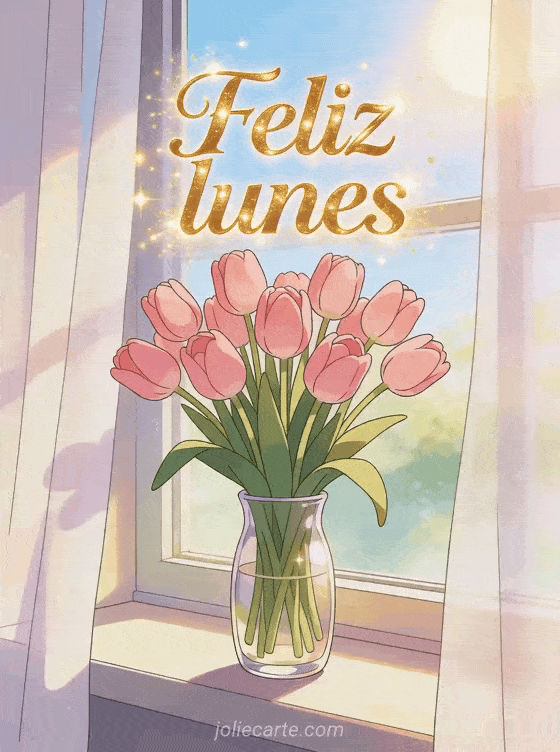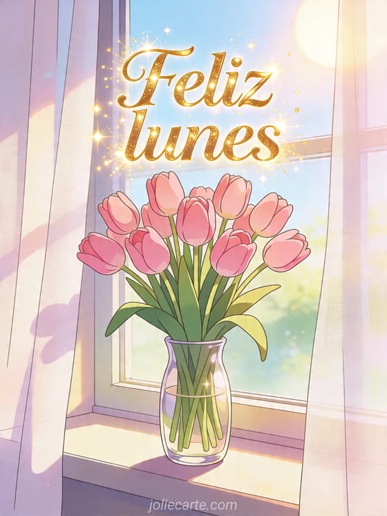 Empieza la semana con dulzura gracias a esta tarjeta elegante que muestra un ramo de tulipanes rosas en un florero de vidrio junto a una ventana iluminada por el sol de la mañana. También pueden descubrir buenos días feliz lunes buena semana besos, buenos días lunes buen comienzo de semana o divertido feliz lunes.
