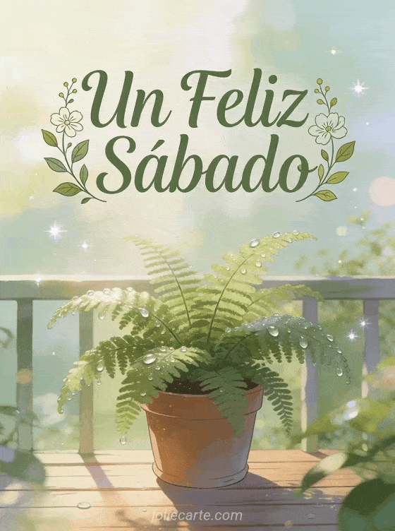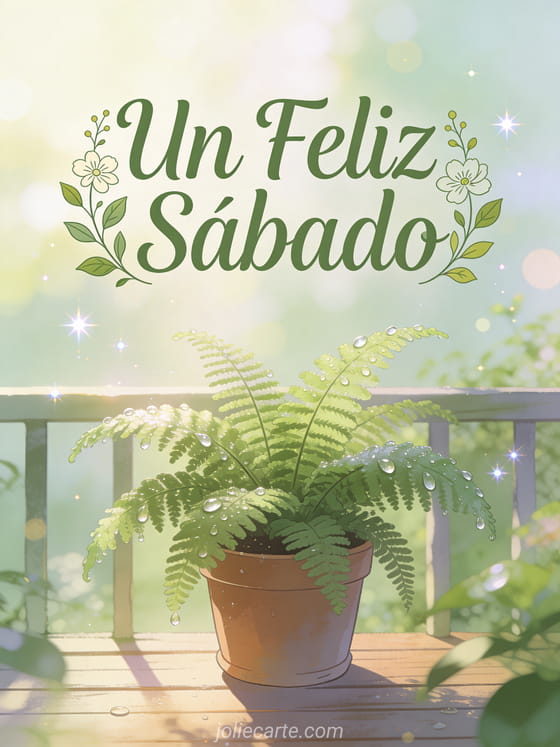 Un feliz sábado un fresco y natural saludo de sábado con un helecho con rocío en una terraza matutina