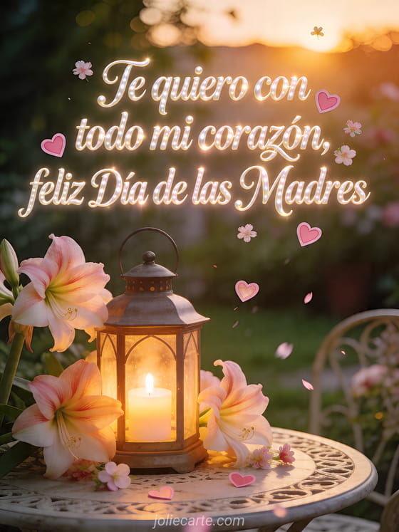 Comparte un poema de amor para el Día de las Madres con caligrafía nacarada, corazones rosados, pequeñas flores y amarilis alrededor de una linterna con vela sobre una mesa de jardín. Esta tarjeta dice te quiero con todo mi corazón. Descubre también feliz Día de la Madre, Feliz Día de las Madres mamá querida o deseo día de la madre a mi hija.