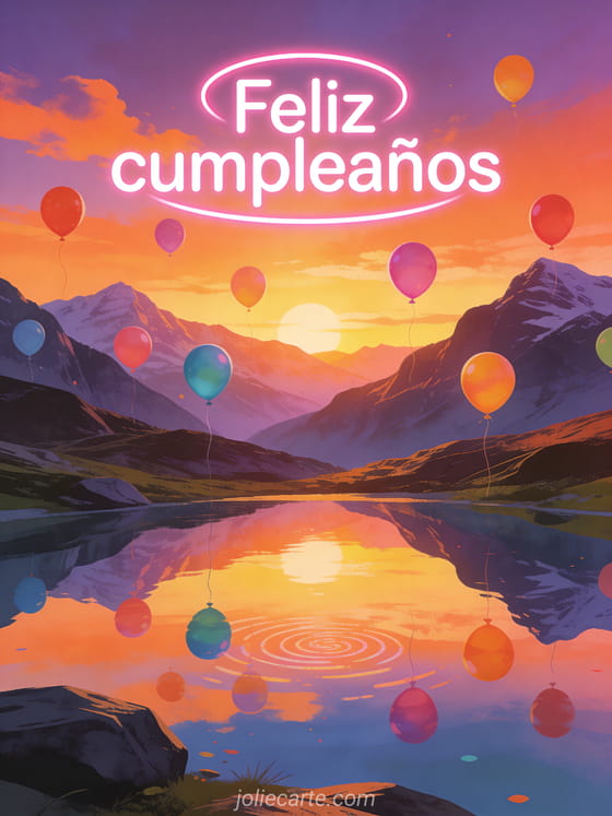 Desea un mágico feliz cumpleaños con esta impresionante tarjeta con montañas al atardecer y globos coloridos reflejados en un lago. Descubre también una tarjeta cumpleaños disfruta cada momento o una tarjeta cumpleaños que seas feliz o una tarjeta cumpleaños sonríele a la vida.