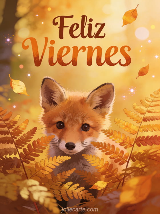 Celebra el viernes con esta encantadora tarjeta con un curioso zorrito asomándose entre helechos otoñales con hojas doradas cayendo en la cálida luz del bosque. Descubre también una imagen de viernes buenos días, un mensaje para desear un feliz viernes o una tarjeta feliz viernes.