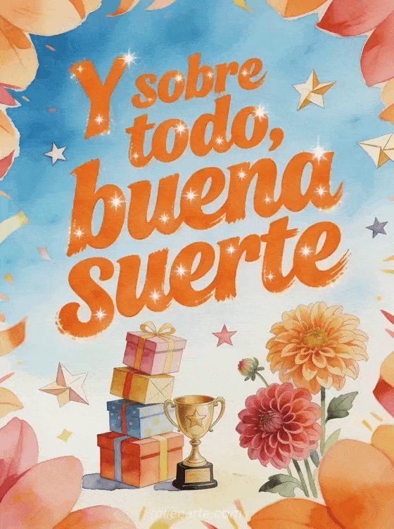 Envíen y luego sobre todo buena suerte gif con letras naranjas, cajas de regalo tambaleantes, un trofeo pequeño de la suerte, dalias y estrellas de papel volando. Descubran también una imagen animada buena suerte, una mucha suerte a todos imagen o un mensaje para desearle mucha suerte a alguien.