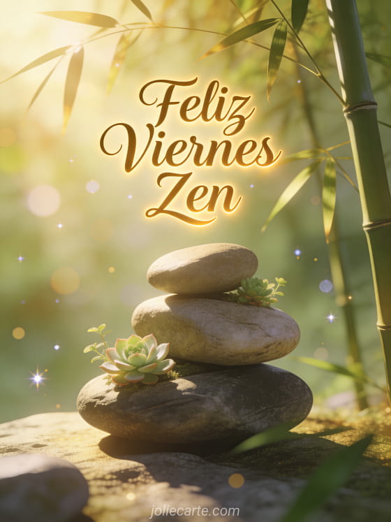 Envía un sereno saludo de feliz viernes zen para llevar calma y equilibrio al día de alguien especial. Una hermosa composición de piedras lisas y bambú en suave luz matinal. Descubre también una tarjeta feliz viernes y buen fin de semana o una gif de viernes con humor.