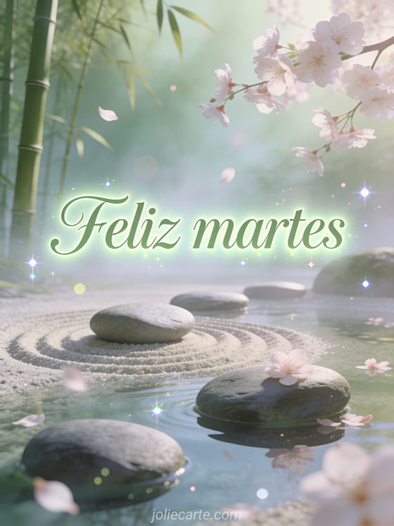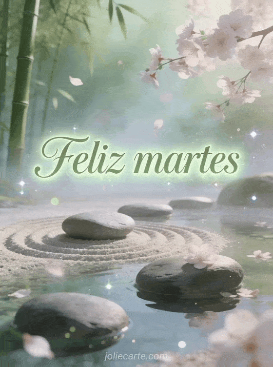 Envía un saludo tranquilo de feliz martes con piedras lisas, flores de cerezo flotando, bambú y un suave brillo verde salvia. Descubre también un feliz martes y que tengas un buen día gif, una pasar un feliz martes o una feliz martes besitos imágenes.