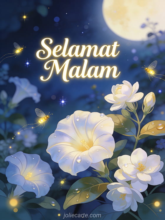 Ucapkan mimpi indah dengan kartu yang menawan ini bergambar bunga malam dan kunang-kunang bercahaya di taman bercahaya bulan. Temukan juga kartu selamat malam dan selamat tidur atau kartu selamat malam mimpi indah.