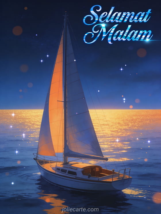 Kirim ucapan selamat malam yang damai dengan kartu indah ini. Sebuah perahu layar elegan meluncur di laut tenang saat senja dengan cakrawala emas, dalam suasana maritim yang damai bernuansa biru tua dan oranye. Temukan juga kartu malam ajaib atau kartu malam zen.