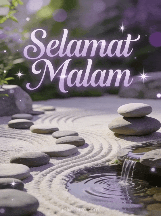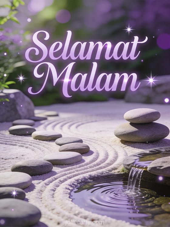Kirim ucapan selamat malam yang damai untuk mengakhiri hari dengan tenang. Taman zen yang tenang dengan batu halus dan air mancur lembut dalam nuansa ungu dan hijau yang menenangkan. Temukan juga kartu selamat malam atau kartu ucapan malam.