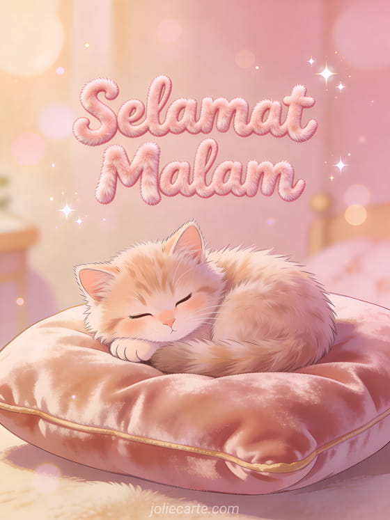 Kirim ucapan selamat malam yang manis dengan kartu menggemaskan ini. Seekor anak kucing berbulu lembut meringkuk di bantal beludru dalam suasana hangat merah muda dan krem, sempurna untuk mengucapkan malam yang nyaman. Temukan juga kartu malam dengan perahu layar atau kartu selamat malam.