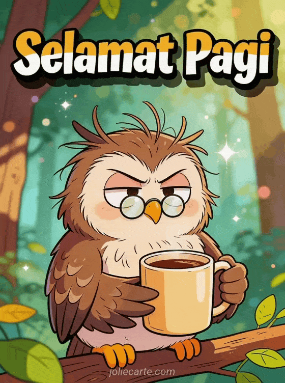 Mulai hari seseorang dengan senyuman dengan kartu selamat pagi yang lucu ini. Seekor burung hantu cemberut dengan kacamata bulat kecil memegang cangkir kopi raksasa, dengan bulu berantakan dan ekspresi mengantuk di hutan kartun.