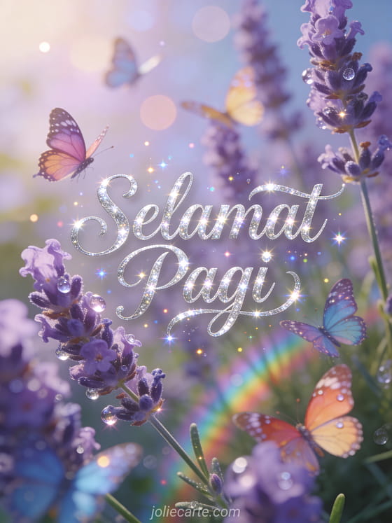Mulai hari seseorang dengan keajaiban dengan kartu selamat pagi yang menakjubkan ini. Kupu-kupu berwarna-warni menari di sekitar bunga lavender dengan tetesan embun yang menangkap cahaya pelangi pagi dalam pemandangan taman dongeng. Temukan juga kartu selamat pagi atau kartu selamat pagi lucu.