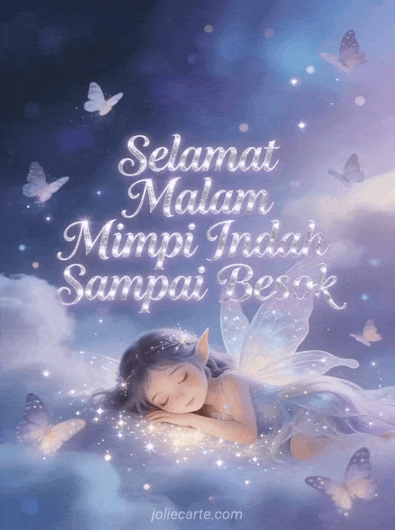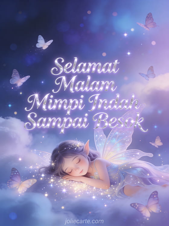 Ucapkan selamat malam yang ajaib dengan kartu mempesona ini yang menampilkan peri tidur dikelilingi kilauan, awan mimpi dan kupu-kupu terbang. Temukan juga kartu selamat malam sampai besok.