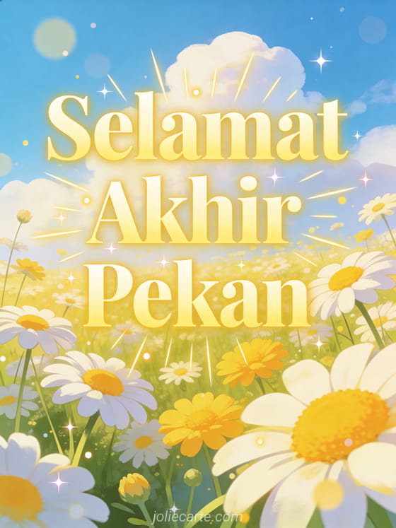 Kirim ucapan selamat akhir pekan yang ceria untuk mencerahkan hari seseorang. Padang rumput musim panas yang indah penuh bunga daisy putih dan kuning di bawah langit biru dengan awan lembut, bermandikan sinar matahari cerah. Temukan juga kartu akhir pekan lucu dengan rakun atau kartu akhir pekan dengan taman.