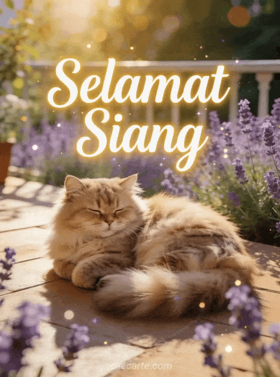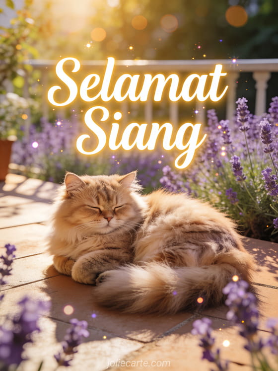 Kirimkan ucapan selamat siang yang indah untuk mencerahkan hari seseorang. Kucing Persia yang menggemaskan tidur siang dengan tenang di teras yang bermandikan sinar matahari keemasan, dengan latar belakang taman lavender yang indah.