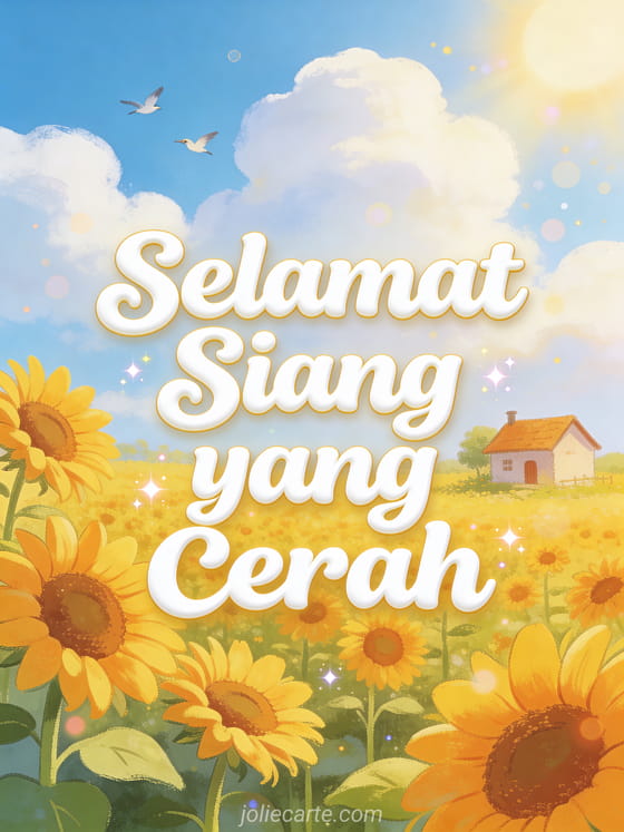 Cerahkan hari seseorang dengan kartu ucapan selamat siang yang cerah ini. Ilustrasi ceria dari ladang bunga matahari dengan rumah kecil, langit biru cerah dengan awan putih lembut dan burung-burung beterbangan. Temukan juga kartu selamat sore atau kartu selamat siang.