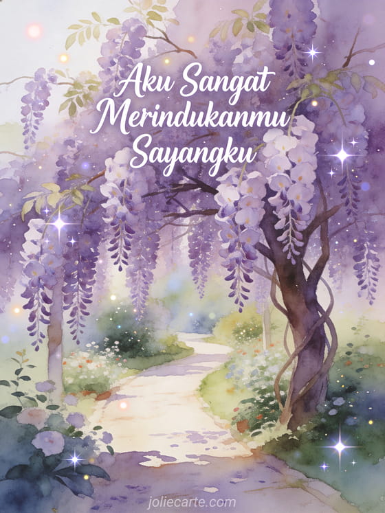 Kirimkan kartu ucapan romantis ini dengan pohon wisteria yang indah bermekaran dengan bunga ungu yang menjuntai di sepanjang jalan taman. Temukan juga kartu aku memikirkanmu aku merindukanmu atau kartu aku mencintaimu aku merindukanmu.