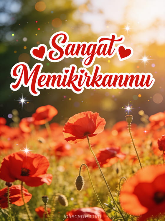 Kirim kartu semangat sangat memikirkanmu dengan ladang bunga poppy merah yang memukau di bawah sinar matahari musim panas. Temukan juga kartu manis aku memikirkanmu atau kartu lucu aku memikirkanmu.
