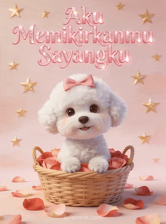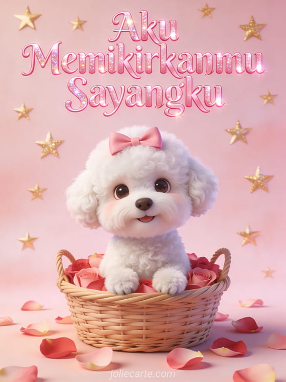 Kirimkan kartu ucapan menggemaskan ini dengan anjing bichon frisé putih yang lucu dengan pita pink dalam keranjang kelopak mawar. Temukan juga kartu aku memikirkanmu sayangku atau kartu kutipan aku memikirkanmu.