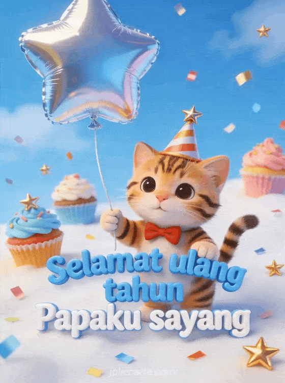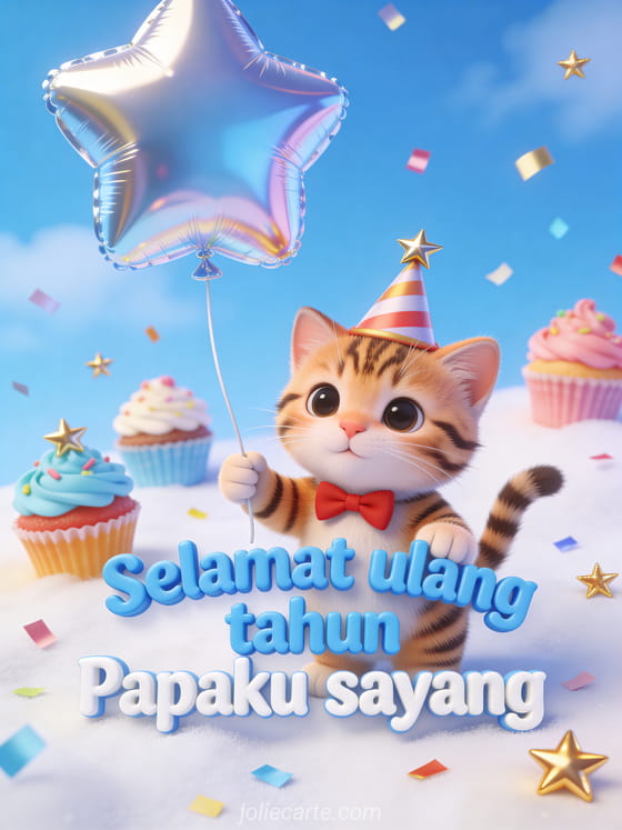 Rayakan ulang tahun Papa Anda dengan kartu gratis yang menggemaskan ini. Anak kucing belang yang lucu dengan topi pesta dan dasi kupu-kupu merah memegang balon bintang, cupcake warna-warni dan konfeti emas. Temukan juga kartu ulang tahun Papa dengan hati atau kartu ulang tahun Papa lucu atau kartu selamat ulang tahun Papa dengan teks.