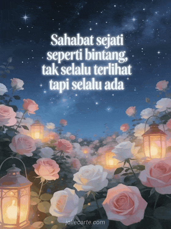 Rayakan ulang tahun seorang sahabat dengan kartu menawan ini yang menampilkan huruf putih bercahaya di bawah langit berbintang di atas taman mawar yang diterangi lentera dalam suasana yang ajaib. Temukan juga kartu ulang tahun untuk sahabat.