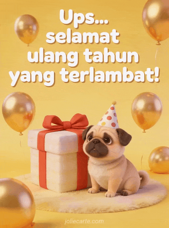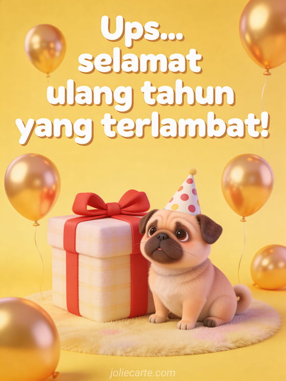 Ups! Kirim kartu ulang tahun terlambat yang lucu ini dengan pug yang menggemaskan, balon dan hadiah. Temukan juga kartu meriah ulang tahun terlambat atau kartu ulang tahun terlambat yang lucu.