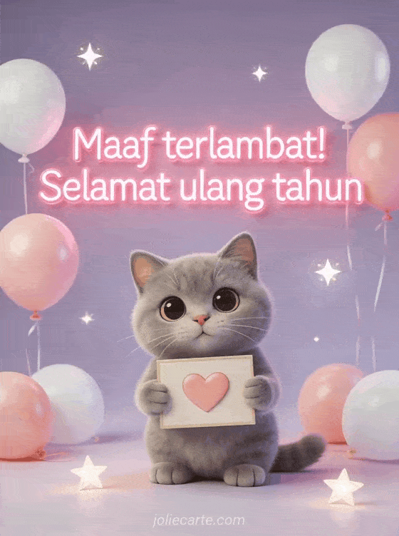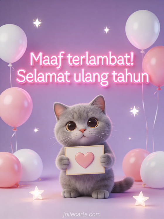 Minta maaf atas keterlambatan dengan kartu ulang tahun yang menggemaskan ini dengan kucing british shorthair, hati dan balon. Temukan juga kartu ulang tahun terlambat yang lucu.