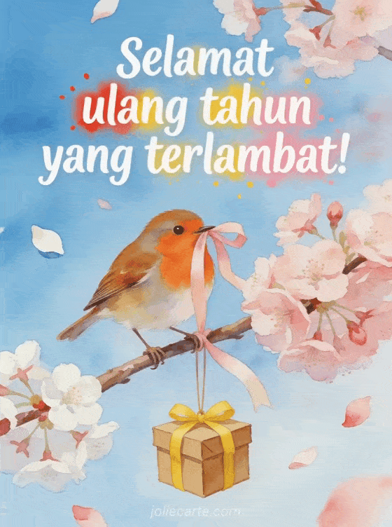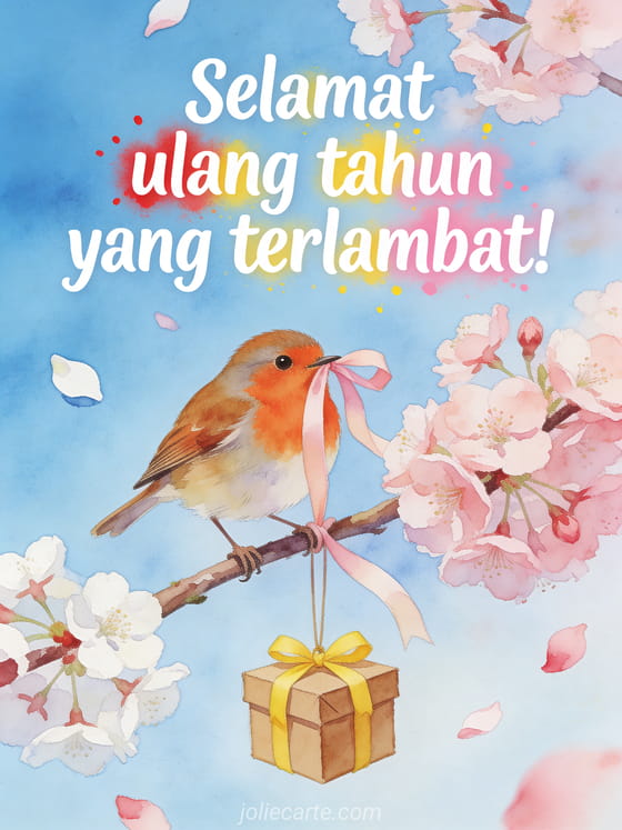 Kirim ucapan ulang tahun terlambat yang halus dengan kartu indah ini dengan burung robin, bunga sakura dan hadiah. Temukan juga kartu ulang tahun terlambat dengan kucing atau kartu ulang tahun terlambat yang lucu.