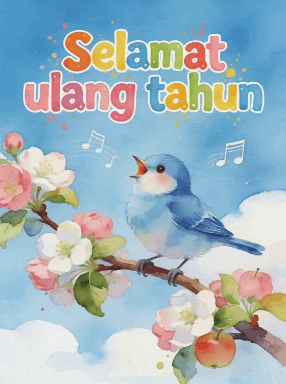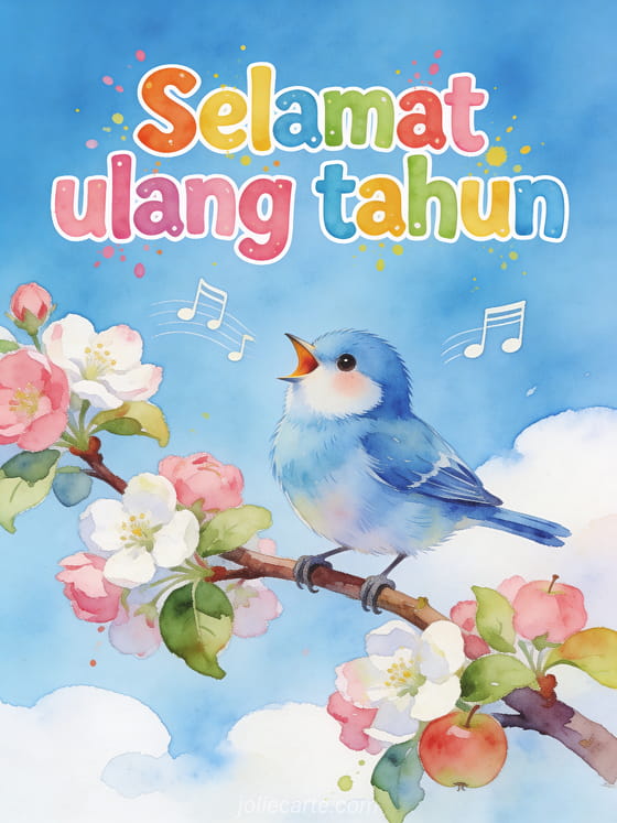 Rayakan ulang tahun dengan kartu gratis yang menawan ini. Burung blue tit yang menggemaskan bernyanyi riang di dahan pohon apel berbunga dengan nada musik, huruf bergaya cat air dan langit biru cerah. Temukan juga kartu selamat ulang tahun saudari atau kartu ulang tahun saudari atau kartu ulang tahun saudari humor.