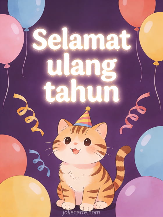 Kirimkan ucapan ulang tahun lucu ini dengan kucing belang yang menggemaskan memakai topi pesta untuk memeriahkan hari istimewa. Temukan juga kartu ulang tahun untuk remaja perempuan atau kartu ulang tahun gratis untuk remaja laki-laki atau kartu ulang tahun untuk remaja laki-laki.
