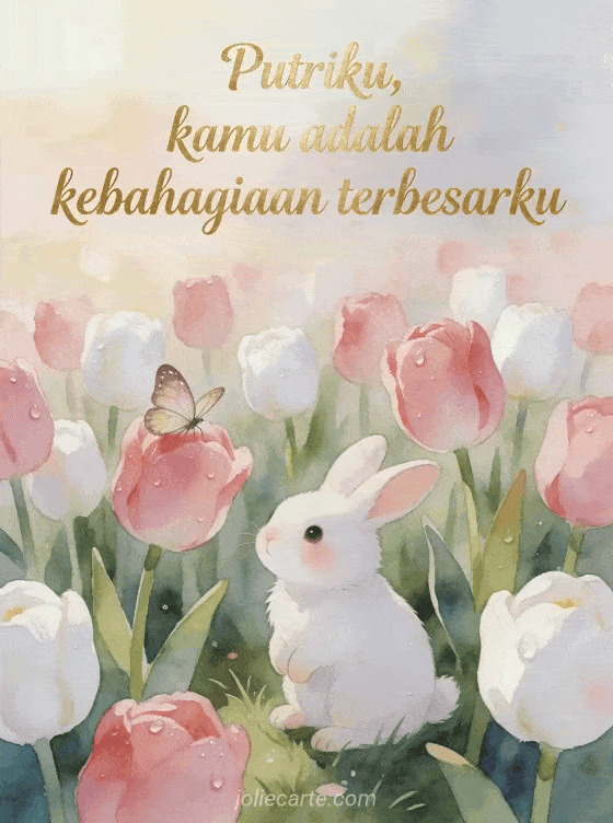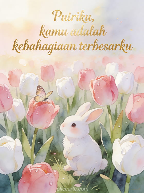 Rayakan ulang tahun putri Anda dengan kartu akuarel cantik bergambar kelinci putih di antara tulip merah muda dan kupu-kupu. Temukan juga kartu ulang tahun untuk putri dari ibu atau kartu ulang tahun putri aku sayang kamu.