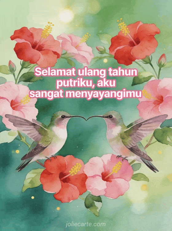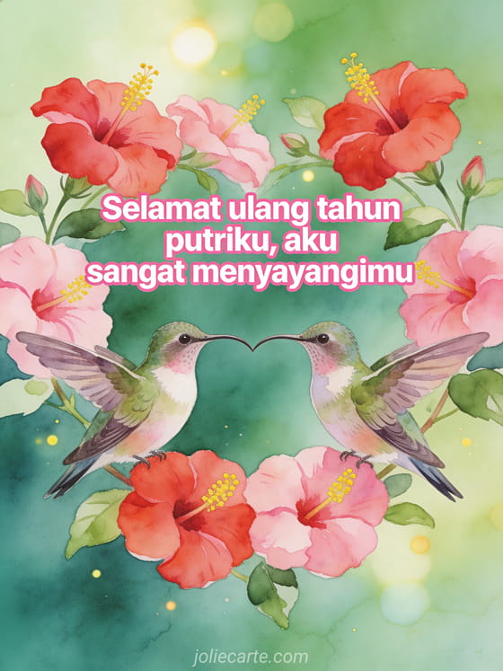 Kirimkan ucapan ulang tahun yang menyentuh untuk putri Anda dengan kartu akuarel cantik bergambar dua kolibri membentuk hati dengan paruhnya di antara bunga kembang sepatu merah muda dan merah. Temukan juga kartu ulang tahun putri tersayang atau pesan ulang tahun untuk putriku.
