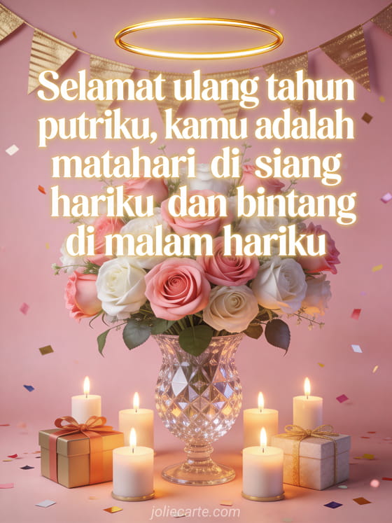 Kamu adalah matahari di siang hariku dan bintang di malam hariku. Kirim kartu ulang tahun romantis ini untuk putri Anda dengan mawar, lilin dan hadiah. Temukan juga kartu ulang tahun menyentuh untuk putri atau puisi ulang tahun untuk putri.