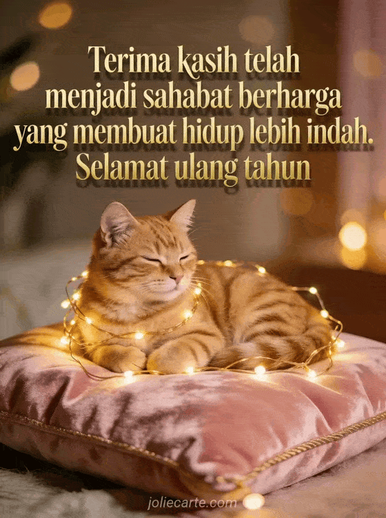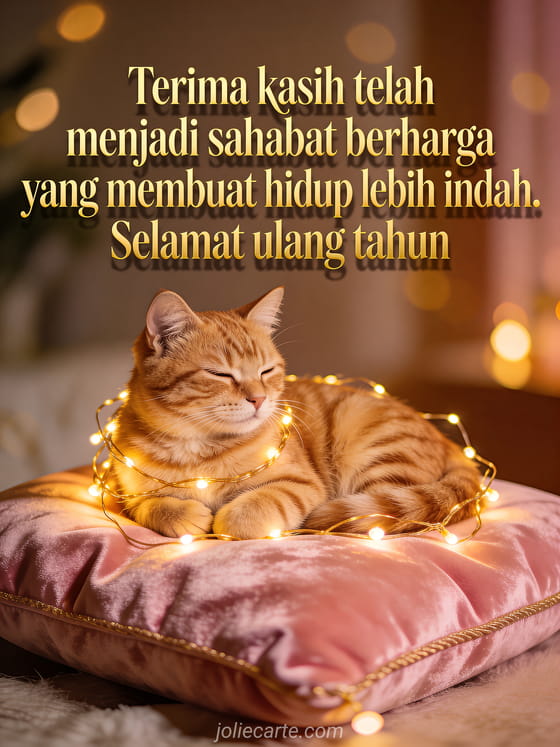 Rayakan ulang tahun seorang sahabat dengan kartu lembut ini yang menampilkan kucing oren berbaring di bantal beludru merah muda dikelilingi garland lampu emas, dalam suasana hangat dan akrab. Temukan juga kartu ulang tahun persahabatan lucu atau kartu ulang tahun untuk sahabat.