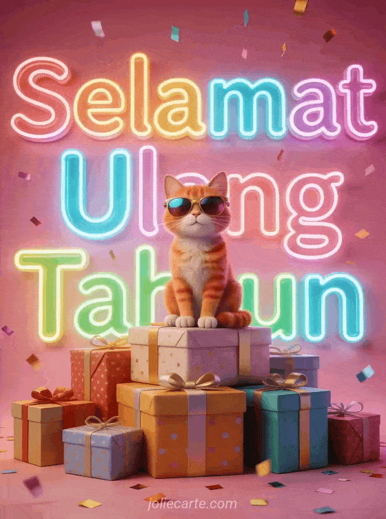 Kirim kartu ulang tahun meriah ini dengan kucing oranye keren berkacamata hitam duduk di atas hadiah dengan lampu neon dan confetti. Temukan juga kartu lucu ulang tahun berang-berang atau kartu glamor ulang tahun kucing.
