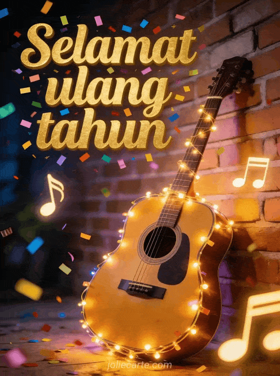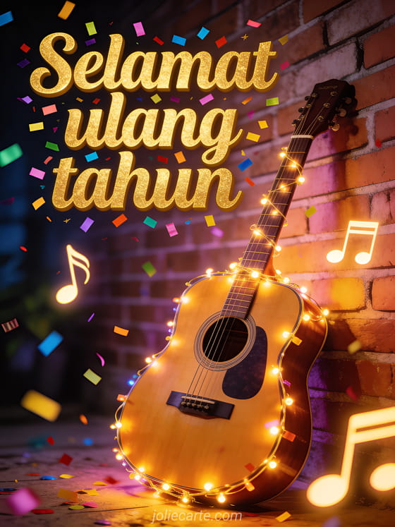 Kirim kartu selamat ulang tahun yang ceria ini dengan huruf emas dan confetti berwarna-warni, gitar akustik yang dihiasi lampu hias di depan dinding bata, dan not musik bercahaya yang melayang di udara. Temukan juga kartu ulang tahun musikal dengan piano atau kartu animasi ulang tahun dengan kotak musik.