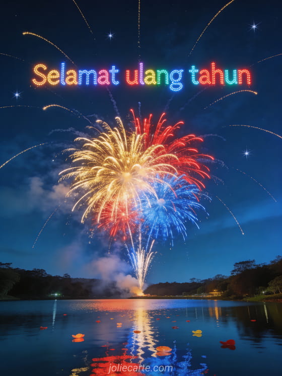 Kirim kartu selamat ulang tahun yang megah ini dengan kembang api spektakuler yang meledak dalam kaskade emas, merah, dan biru di atas danau, dengan bintang jatuh dan pantulan cahaya yang berkilauan di air. Temukan juga kartu animasi ulang tahun dengan bunga.