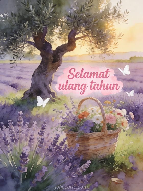 Kirim kartu selamat ulang tahun yang menawan ini dengan ladang lavender di Provence, pohon zaitun berusia ratusan tahun, keranjang bunga liar, dan kupu-kupu putih yang menari dalam cahaya keemasan sore hari.